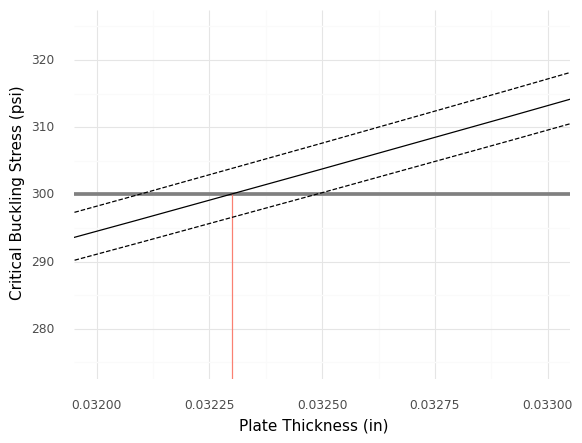 The case AR == 1 clearly has a lower buckling stress than the lowest AR == 1.5 case; independent of the material variability, we can determine that AR == 1.5 is a better choice for our application.